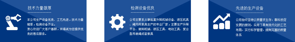 本公司系從事起重升降機(jī)械設(shè)備、液壓機(jī)具、繩網(wǎng)吊索具生產(chǎn)的專業(yè)廠家,主要生產(chǎn)千斤頂、液壓拉馬、軸承加熱器、升降平臺、裝卸機(jī)械、液壓工具、電動(dòng)工具、復(fù)合型吊裝繩成套索具、高強(qiáng)纖維柔性吊裝帶、起重鏈條成套索具、橫梁吊具、注塑繩、軟梯、安全帶、安全網(wǎng)等幾大系列、上百種規(guī)格的產(chǎn)品,廣泛應(yīng)用于電力、油田、大型鋼廠、機(jī)電、化工、航空、冶金、機(jī)械、鐵道、造紙、港口、建筑等領(lǐng)域。
